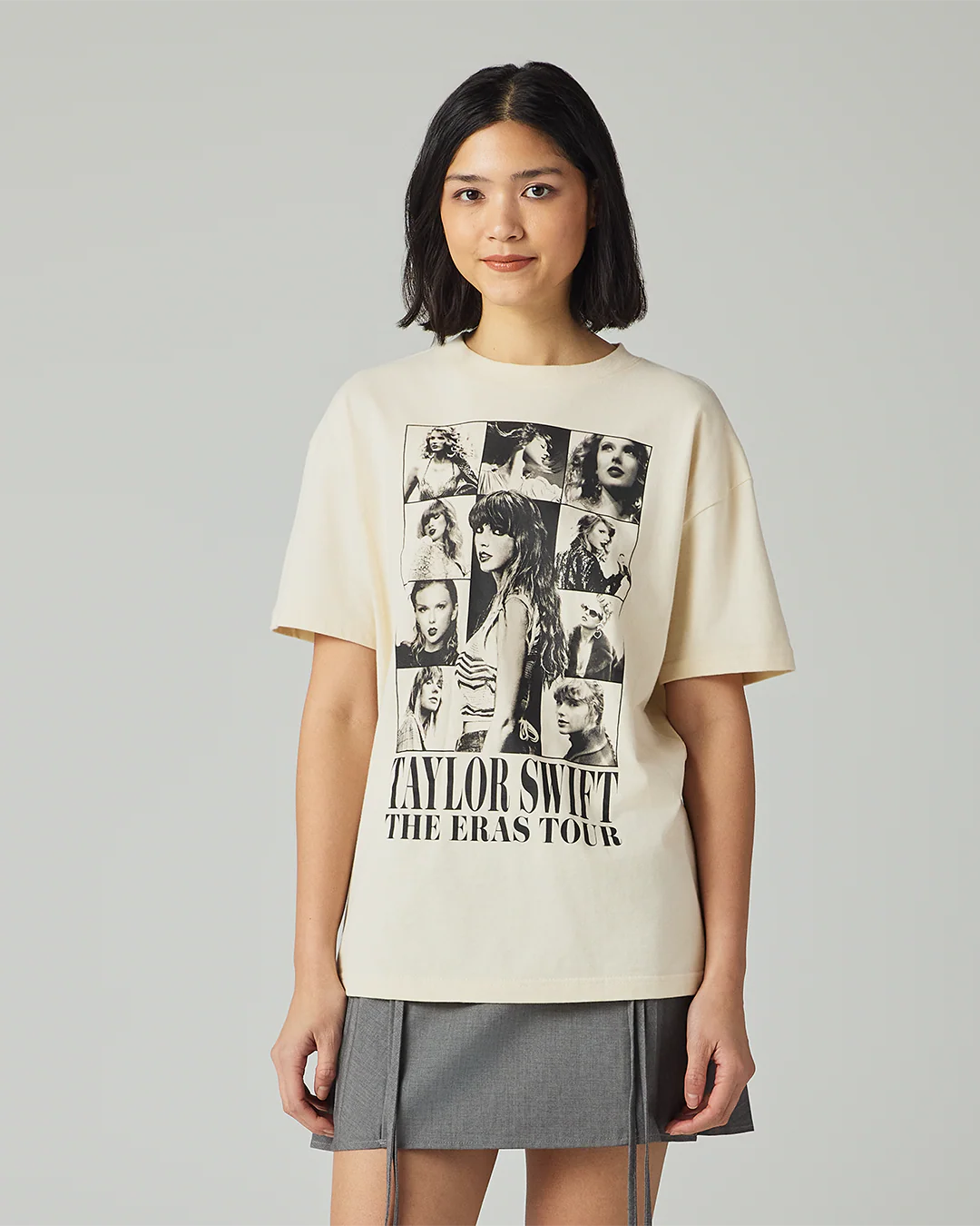 Beige t-shirt featuring "Taylor Swift | The Eras Tour" and photos of Taylor Swift printed on front with "Taylor Swift | The Eras Tour", United States tour locations, and Taylor Swift album titles printed on back.