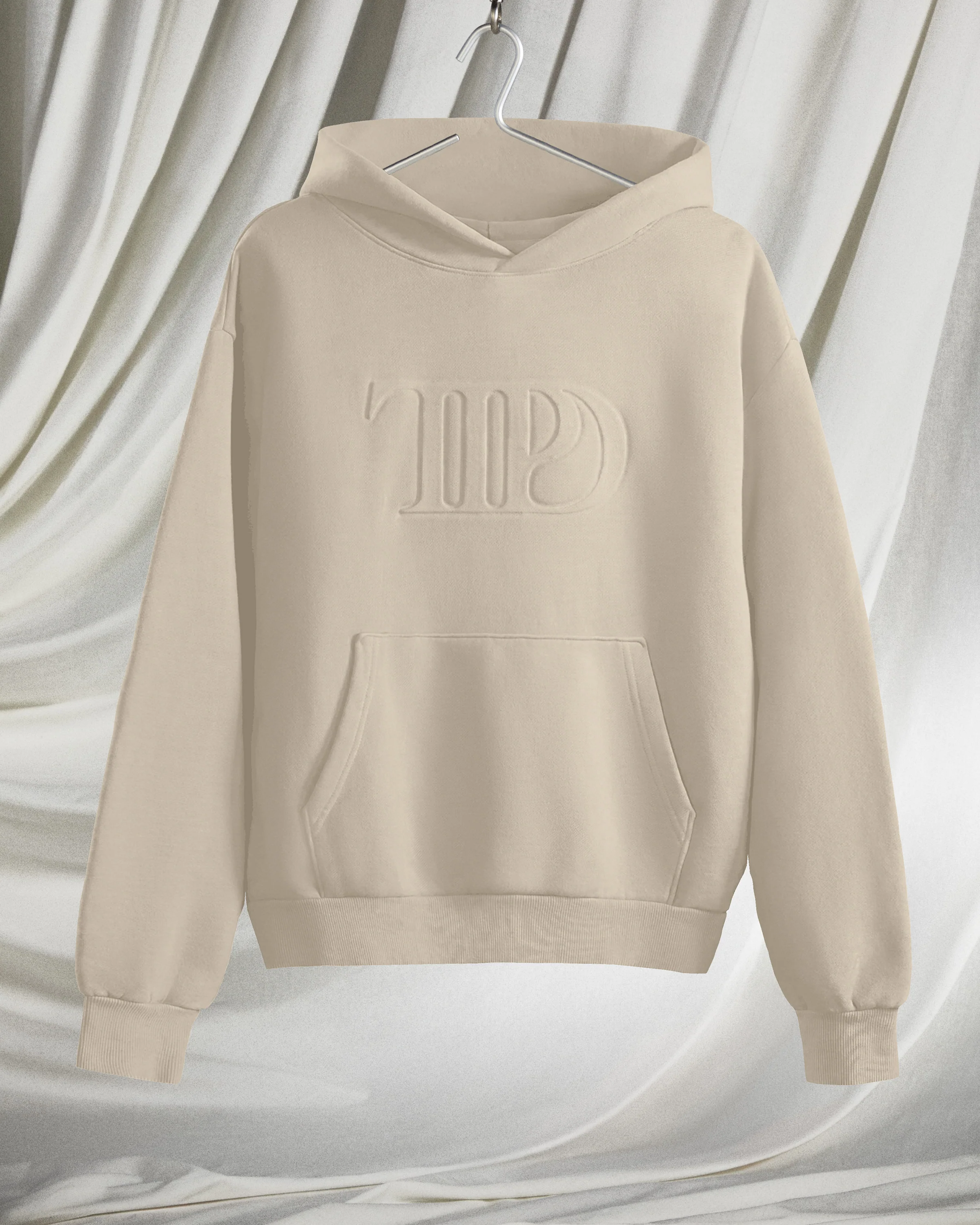 Parchment beige hoodie with front pocket featuring embossed "TTPD" album logo on front.