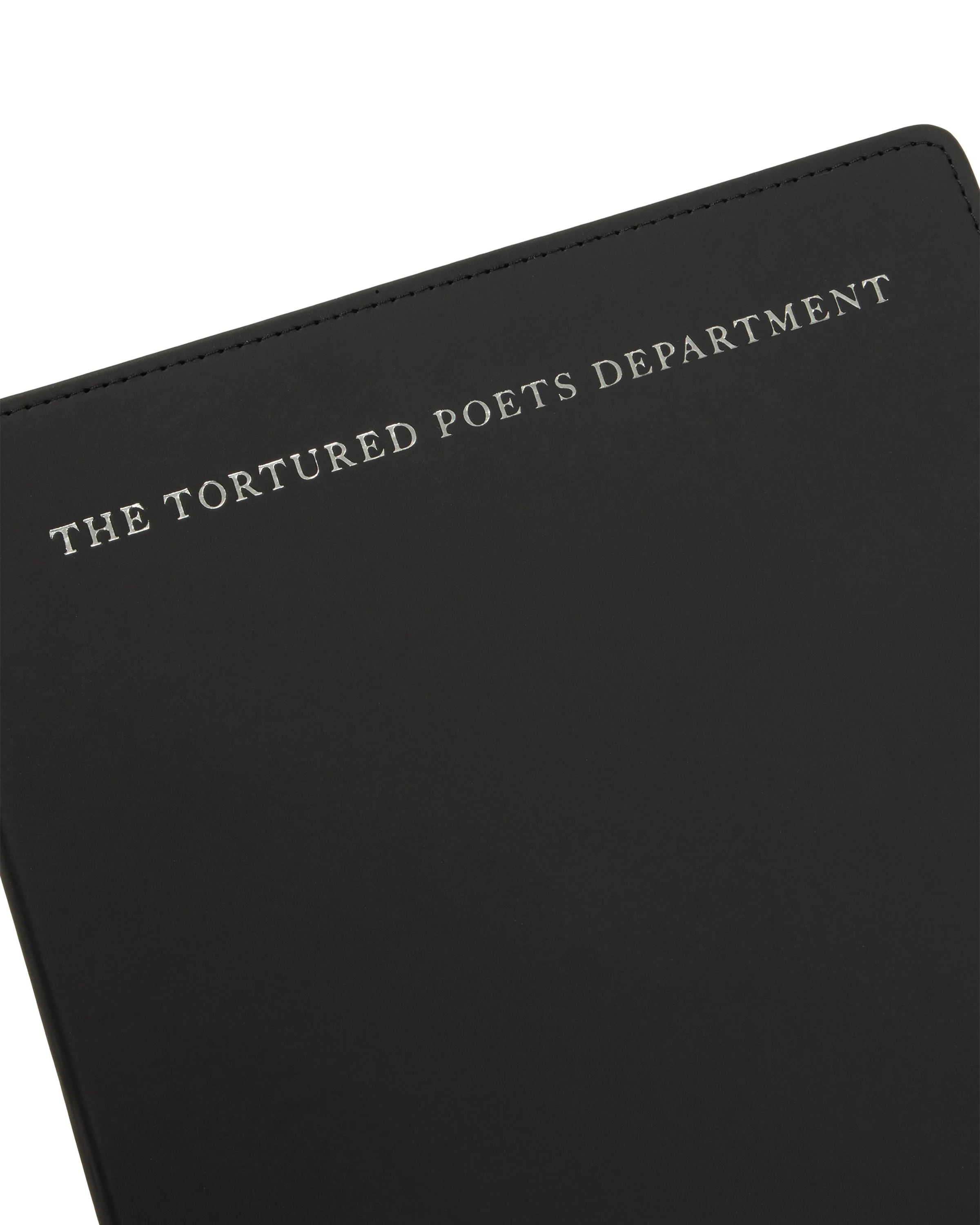 Black leather notebook featuring "The Tortured Poets Department" and "TTPD" album logo printed on front in silver foil with double line design and "From The Desk Of" and" Taylor Swift" with box design printed on each page.