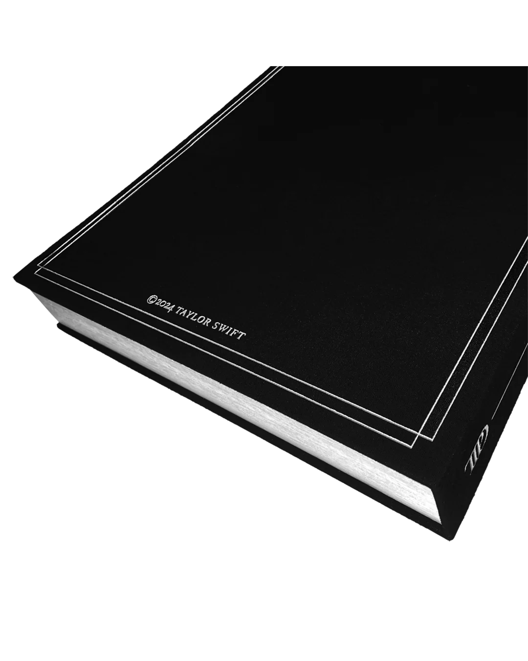 Black vinyl display case featuring metallic silver double line border design, "TTPD" album logo, and "The Tortured Poets Department" embossed on front with "TTPD" album logo, line design, and "Taylor Swift" embossed on side and "©2024 Taylor Swift" with metallic silver double line border design embossed on back.